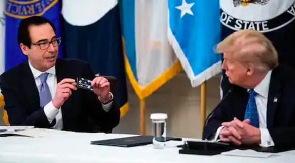 Cựu Bộ trưởng Tài chính Mỹ, ông Steven Mnuchin, giơ lên cho cựu Tổng thống Donald Trump xem một chiếc thẻ được dùng để gửi tiền hỗ trợ cho người Mỹ trong một cuộc họp nội các tại Nhà Trắng hồi tháng 5-2020. Ảnh: The Washington Post