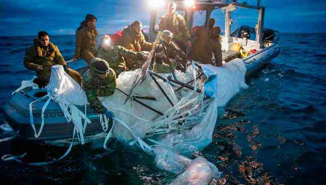 Các thuỷ thủ Mỹ vớt xác khinh khí cầu Trung Quốc rơi xuống biển. (Ảnh: Hải quân Mỹ)