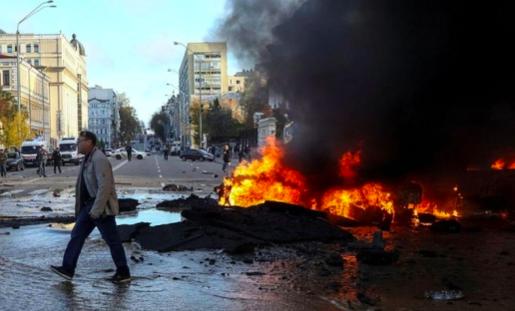 Ô tô bốc cháy sau một cuộc tấn công của quân đội Nga ở thủ đô Kiev. Ảnh: Reuters