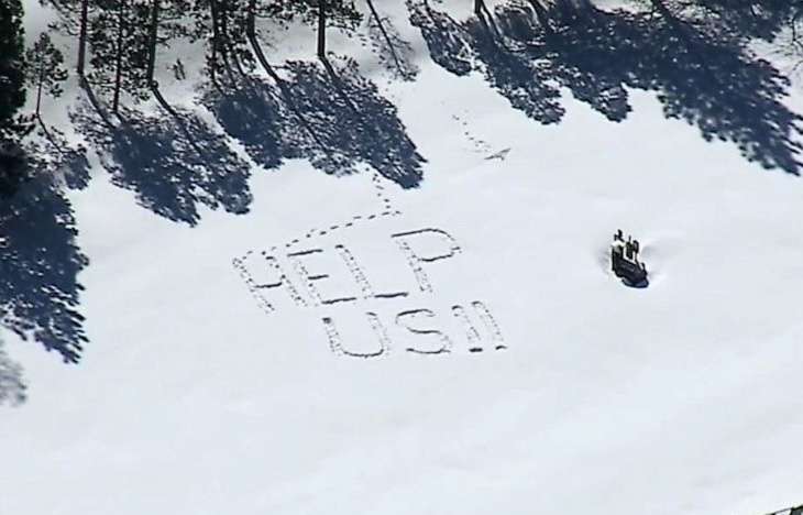 Thông điệp 'Cứu chúng tôi' trên tuyết trắng. Ảnh: KABC.
