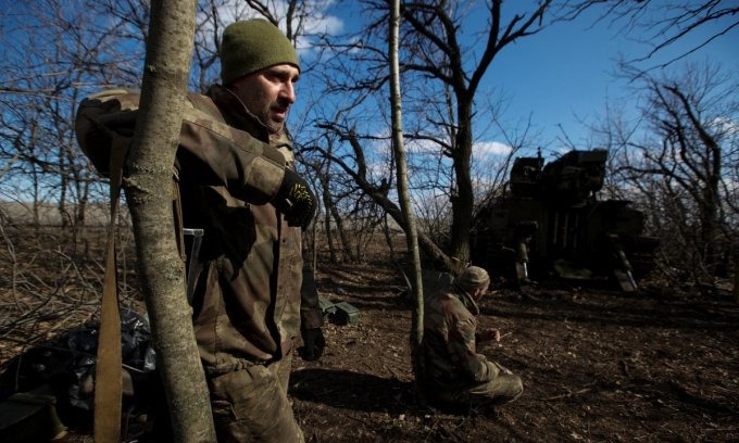 Lính Ukraine bên cạnh hệ thống pháo tự hành ở ngoại ô Bakhmut hôm 5/3. Ảnh: Reuters.