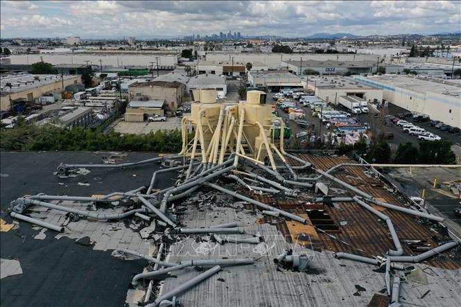 Mái của một khu công nghiệp bị hư hại do lốc xoáy tại hạt Los Angeles, bang California (Mỹ) ngày 23/3/2023. Ảnh minh họa: AFP