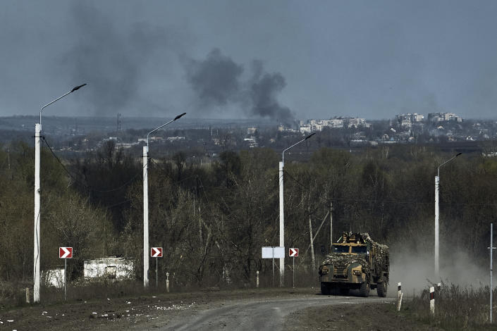Một chiếc APC của Ukraine được nhìn thấy trên đường ở tiền tuyến ở Bakhmut ngày 9/4/ 2023. Ảnh AP