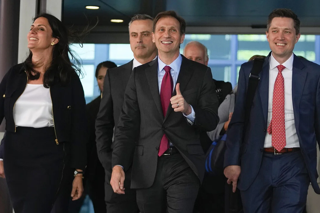 Nhóm luật sư đại diện công ty Dominion vui mừng rời khỏi tòa án hạt New Castle ở Wilmington, bang Delaware, Mỹ sau khi đạt thỏa thuận dàn xếp với Fox News. Ảnh: AP