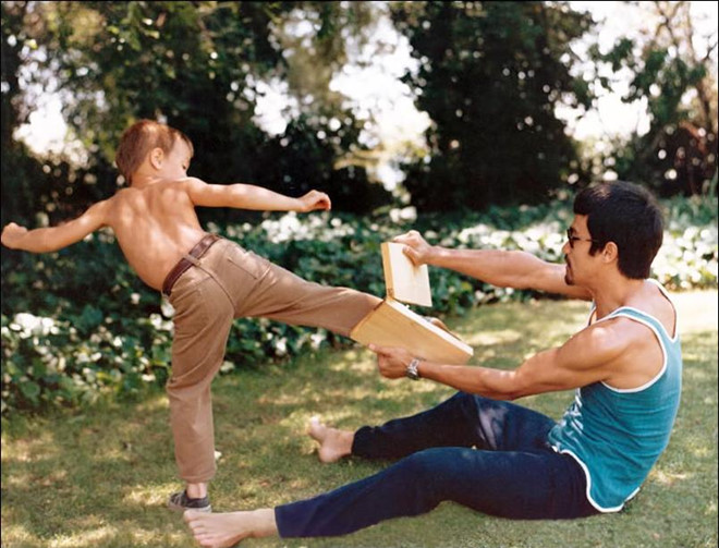 Lý Quốc Hào cùng cha Lý Tiểu Long tập luyện võ thuật.
