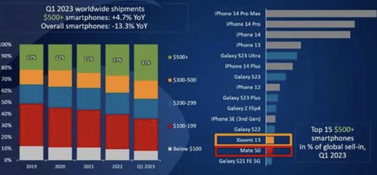 Xiaomi 13 và Huawei Mate50 dù có mặt trong top 15, nhưng lần lượt xếp thứ 13 và 14. Ở trên chúng là Apple với 7 mẫu và Samsung là 6 mẫu.