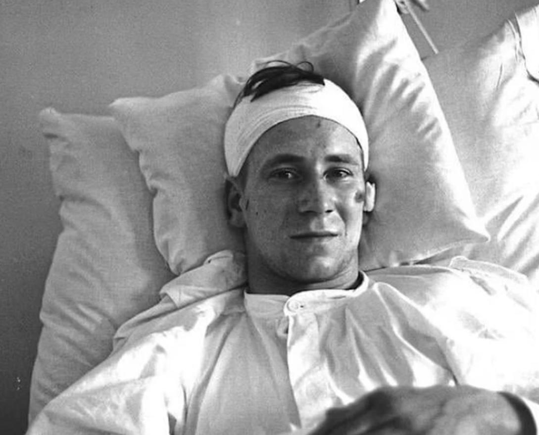 Bobby Charlton nằm trong bệnh viện sau tai nạn máy bay ở Munich năm 1958.