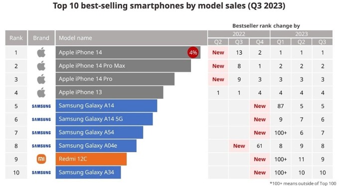 Theo thống kê của công ty phân tích thị trường Canalys, iPhone 14 vẫn là điện thoại được ưa chuộng nhất thế giới, tương tự quý trước đó, tiếp theo là 14 Pro Max, 14 Pro và iPhone 13. Samsung chiếm năm vị trí, đều là model thuộc dòng Galaxy A, gồm A14, A14 5G, A54, A04e và A34. Xiaomi có một model là Redmi 12C xếp ở vị trí thứ 9.