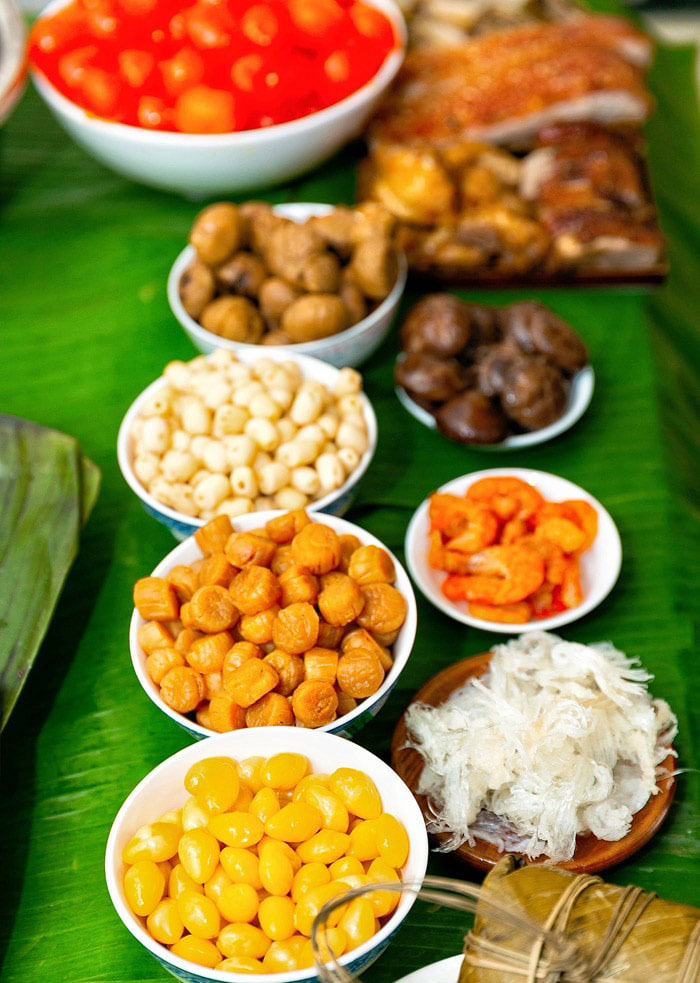 Ngoài ra, phần thịt làm nhân bánh cũng phải được tẩm ướp kĩ càng trước khi gói. Nhân bánh như vị tôm, khô, lạp xưởng, trứng muối, thịt đùi heo, trứng bắc thảo có thể thêm bớt rất linh hoạt. Thậm chí nhiều nơi còn cho thêm sò điệp, bào ngư vào để tăng thêm hương vị sang trọng cho món ăn truyền thống. Các nguyên liệu làm nhân bánh sẽ được tẩm ướp và sơ chế cho thật vừa miệng người ăn trước khi gói.