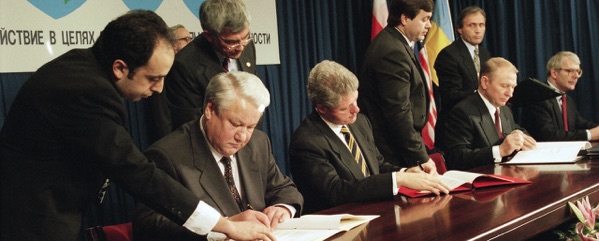 Năm 1994, Ukraine tham gia Hiệp ước không phổ biến vũ khí hạt nhân (NPT) với tư cách là một quốc gia không có vũ khí hạt nhân, tiến hành chuyển giao tất cả các đầu đạn hạt nhân cho Nga và tháo dỡ tất cả các phương tiện vận chuyển chiến lược với sự hỗ trợ kỹ thuật của Mỹ.