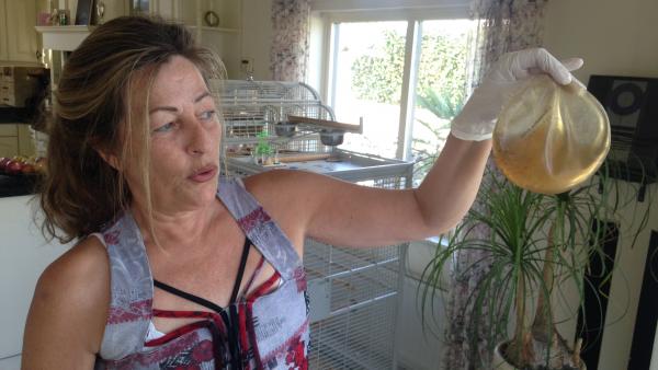 Bà Marga van Amersfoort, chủ tịch hiệp hội các nạn nhân ghép độn silicone giữ lại túi silicone đă dùng để làm bằng chứng buộc tội tại ṭa án.Rfi/Antoine Mouteau