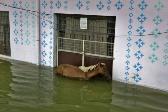 Một con ngựa chôn chân giữa nước lũ bên ngoài một ngôi nhà ở Uttar Pradesh. Ảnh: AP
