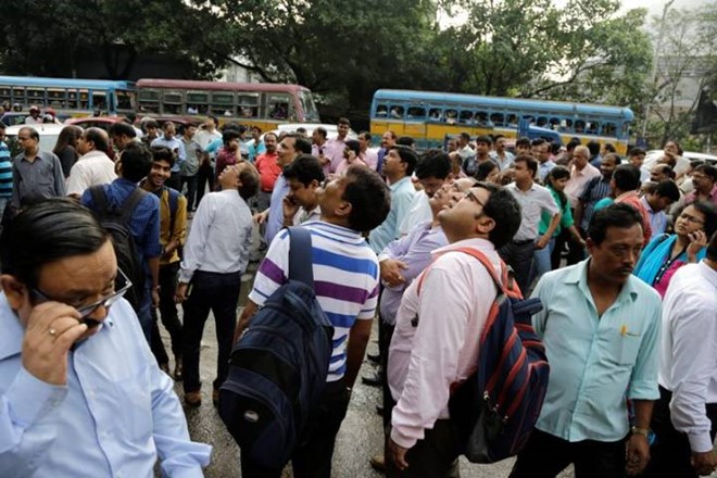 Người dân làm việc ở những tòa nhà cao tầng tại Kolkata , Ấn Độ, đổ ra đường sau khi cảm nhận được những trận rung lắc chiều 24/8. Ảnh: AP