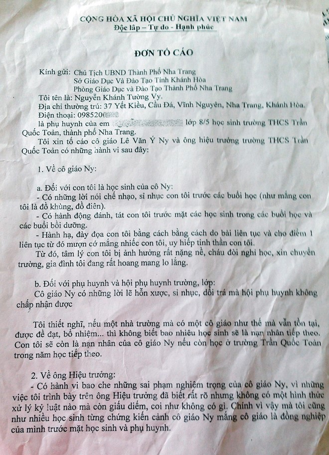 Trong văn bản báo cáo gửi UBND TP Nha Trang, Phòng GD-ĐT trình bày, sau khi có đơn tố cáo của phụ huynh, Phòng đã chỉ đạo Trường THCS Trần Quốc Toản xem xét nội dung đơn và xử lý theo quy định hiện hành.