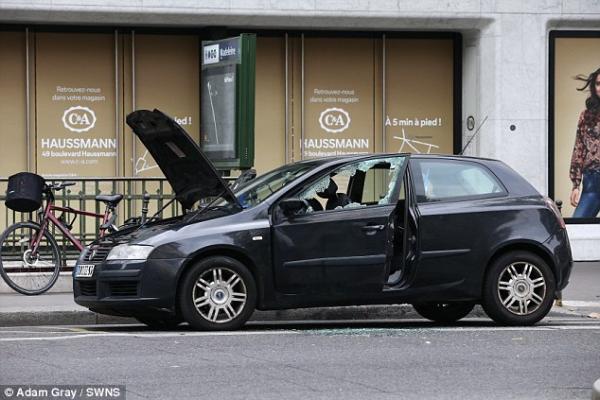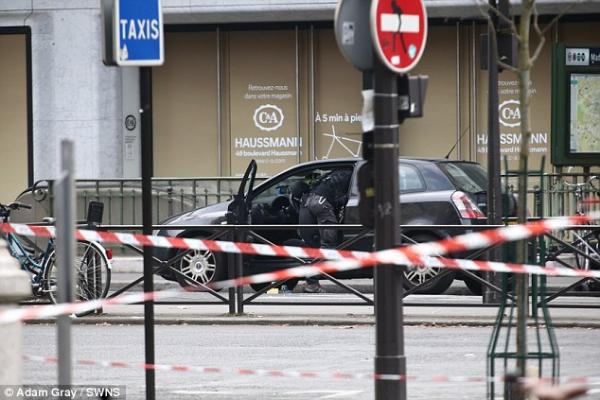 Hình ảnh tại hiện trường cho thấy các cảnh sát tập trung điều tra một chiếc xe Fiat màu đen đỗ bên vệ đường trên đại lộ Boulevard de la Madeleine.