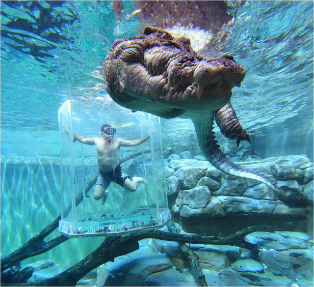 Nếu bạn muốn biết cảm giác bơi cạnh cá sấu và chiêm ngưỡng hàm răng sắc nhọn của nó là như thế nào thì bạn hãy thử tham gia dịch vụ này xem. Đó là dịch vụ của công viên giải trí Crocosaurus Cove ở thành phố Darwin, Australia. Bơi trong lồng kính trong suốt, trải nghiệm chân thực nhất luôn đó.