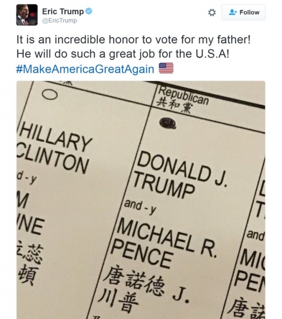 Eric Trump: “Thật là một niềm vinh hạnh lớn lao khi được bỏ phiếu cho cha! Ông sẽ làm được những điều vĩ đại cho nước Mỹ!”