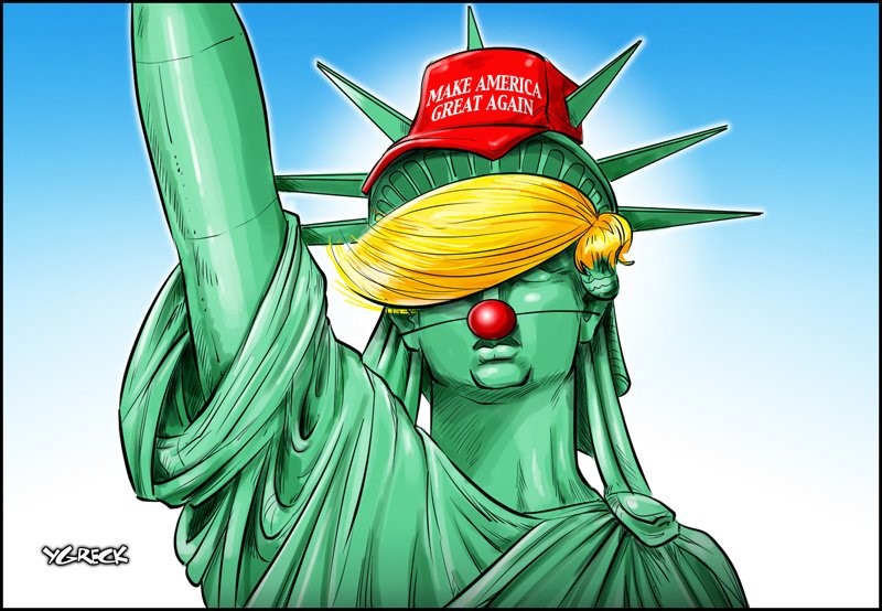 Trong tranh biếm hoạ, bức tượng Nữ thần Tự do sẽ có một diện mạo độc đáo mới, mang đậm hình ảnh tổng thống đắc cử Trump với mũi cà chua, kiểu tóc vàng "bồng bềnh" và chiếc mũ mang khẩu hiệu "Khôi phục nước Mỹ vĩ đại trở lại". Tranh: Twitter YGreck