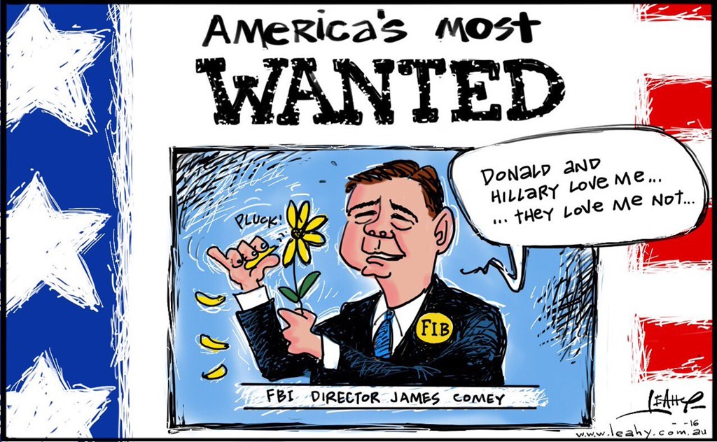 Các hoạ sĩ tranh châm biếm còn cho rằng người Mỹ đang "truy nã" Giám đốc Cục điều tra Liên bang Mỹ (FBI) James Comey vì ông này gây ra thất bại cho đảng Dân chủ. Tò mò về tình cảm của 2 ứng viên tổng thống dành cho mình, ông Comey ngồi chơi trò ngắt cánh hoa và lẩm nhẩm: "Yêu. Không yêu. Yêu". Tranh: Leahy