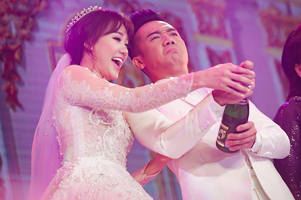 Nếu như Hari Won thoải mái cười rạng rỡ thì Trấn Thành lại thể hiện biểu cảm đầy áp lực khi chuẩn bị mở chai rượu cưới.