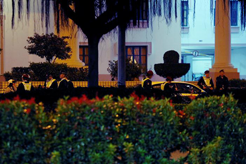 Các cảnh sát gần Ocean Garden, khu chung cư được cho là nơi gia đình Kim Jong-nam sinh sống ở Macau, Trung Quốc. Ảnh: Reuters