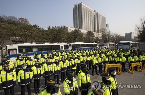 An ninh siết chặt và tăng cường bên ngoài phiên điều trần. Ảnh: Yonhap