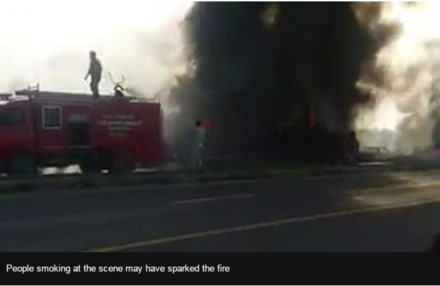 Khoảng 10 phút sau, xe chở dầu phát nổ lớn, cầu lửa bốc cao. Cảnh sát chưa rõ nguyên nhân lửa bùng phát dù có nhiều thông tin lửa bắt nguồn từ một điếu thuốc hoặc từ một chiếc motor.