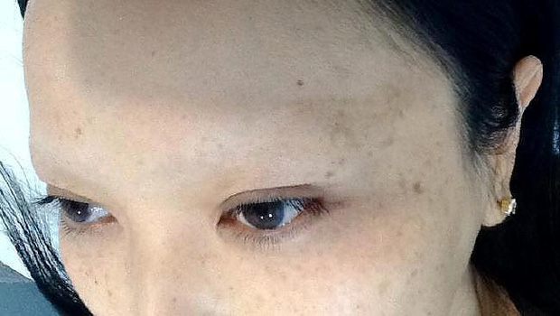 2 năm trước, Kym Lee quyết định xăm lông mày để đỡ tốn thời gian trang điểm mỗi ngày. Một thời gian sau, hàng lông mày bong màu loang lổ, nhìn nham nhở, mất thẩm mỹ. Không còn ưng ý với dáng lông mày cũ, Kym Lee quyết định đi xóa xăm bằng laser.