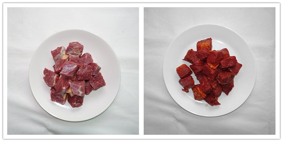 Cà rốt, khoai tây, hành tây cắt miếng to, cà chua chia bốn. Dùng nước nóng tráng qua rồi nhanh tay thả vào nước lạnh, như vậy sẽ dễ bóc vỏ. Lấy 1 chảo dầu khác, đổ dầu và thả hành tây vào đảo thơm, rồi cho cà rốt và khoai tây vào xào đến khi chuyển màu thì cho tiếp cà chua vào đảo thành một hỗn hợp sệt thơm ngây ngất.