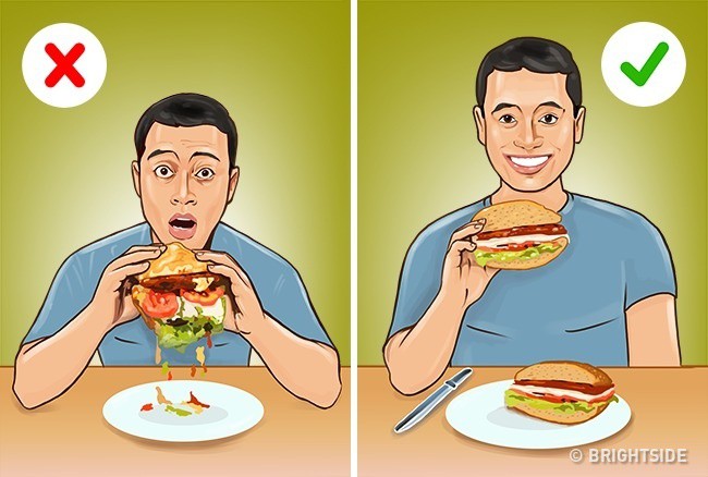 8. Trông thật phản cảm nếu ăn hamburger mà để nhân vương vãi khắp bàn. Thay vì phải nhồm nhoàm ăn cả cái to, hãy cắt làm đôi và thưởng thức.