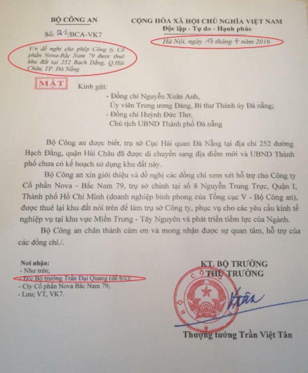Tất cả các công văn đều viết rơ: “ Công ty CP Nova Bắc Nam 79, công ty b́nh phong của tổng cục 5 Bộ Công An”.