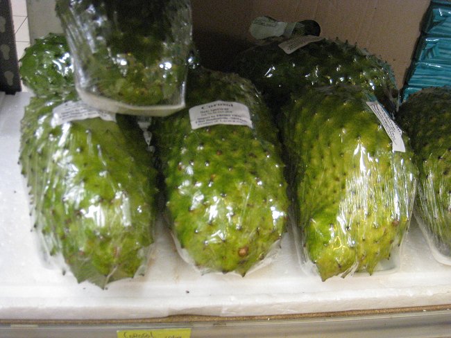 Tạt qua bên kia, tôi thấy mãng cầu hai thứ Ta và Xiêm. Thứ của Xiêm - corossol quả to hơn nhiều và có gai nhọn, tên khoa học annona muricata, gốc Nam Mỹ. Những ngày còn xe nước sinh tố, thì thứ mãng cầu Xiêm này đem xay nhuyễn thêm đá lạnh và sữa cùng đường là nước giải khát tuyệt diệu.