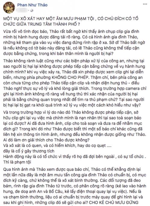 Qua hình ảnh mà Thảo xem được qua báo chí, Thảo có thể khẳng định lại một lần nữa đây là một âm mưu tấn công gia đình Thảo có chuẩn bị, có mục đích kỹ càng, chứ không thể là xô xát bình thường. Các đối tượng đã đeo bám, rình rập gia đình Thảo từ trước, có phân công rõ ràng (kẻ lao vào hành hung, đe doạ anh An và Bồ Câu, kẻ lấy điện thoại quay lại vụ việc)” - cô viết.