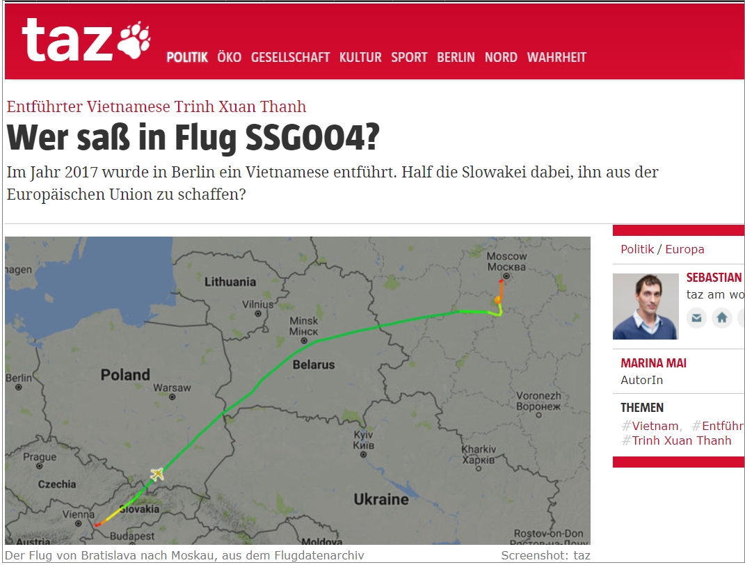 Ba ngày sau khi vụ bắt cóc Trịnh Xuân Thanh xảy ra, ngay sau 12:30 giờ trưa ngày thứ Tư 26.07.2017, bốn người đàn ông nói trên từ Praha đă bay đến Bratislava trên một chiếc chuyên cơ Airbus A 319 của chính phủ Slovakia. Đúng 13:15 giờ chiếc chuyên cơ hạ cánh trên sân bay Bratislava và ở đó 1 tiếng rưỡi đồng hồ. Bởi v́ lúc 14:52 giờ chiếc chuyên cơ lại cất cánh bay đến Moscow thủ đô Nga. Các phóng viên của tờ TAZ có thể tái tạo lại hành tŕnh bay dựa trên cơ sở lưu trữ dữ liệu không lưu của chuyến bay.