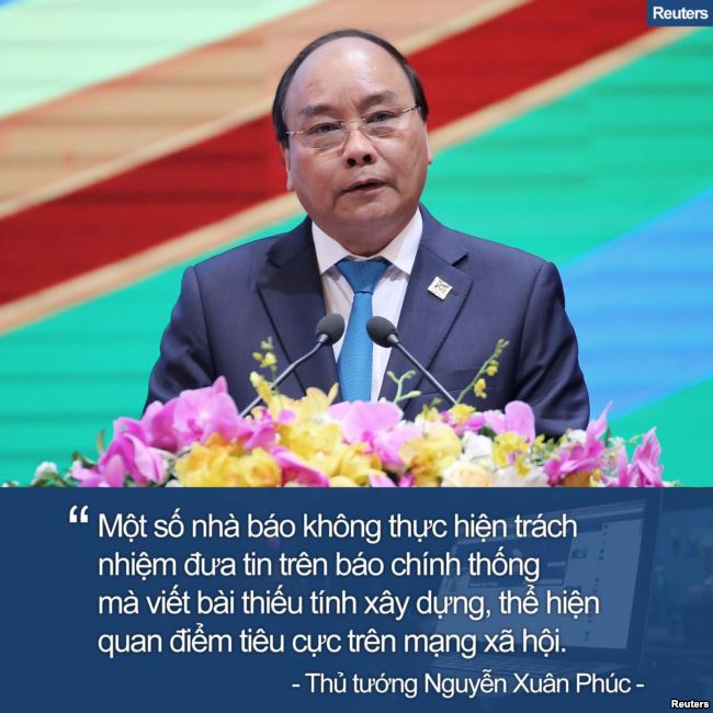 Trong buổi gặp mặt báo chí hôm 20/6 tại Hà Nội, người đứng đầu chính phủ Việt Nam gọi các nhà báo lăo thành và những người đứng đầu các cơ quan báo chí là ‘đồng chí’, và ‘lưu ư’ họ rằng hiện nay “trên mạng xă hội có nhiều thông tin trái chiều với luận điệu sai trái, bị các đối tượng phản động lợi dụng”, theo truyền thông trong nước.