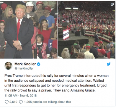 Khi một phụ nữ tham gia mít tinh vận động bỏ phiếu giữa nhiệm kỳ thì bị ngất xỉu. Ông Trump đề nghị mọi người tham gia cầu nguyện cho người phụ nữ này khiến ai cũng ấm lòng.