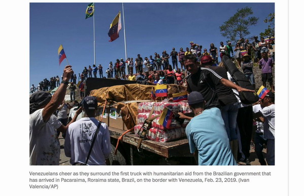Sốc: Guaido đích thân lái xe tải hàng viện trợ vào Venezuela. "Tổng thống Guaido đang đích thân dẫn đầu nỗ lực mang viện trợ cho người dân Venezuela. Quân đội có cơ hội bảo vệ và giúp đỡ người dân Venezuela, chứ không phải Maduro và một nhóm trộm. Chọn con đường dân chủ." Cố vấn an ninh quốc gia của Hoa Kỳ, John Robert Bolton.