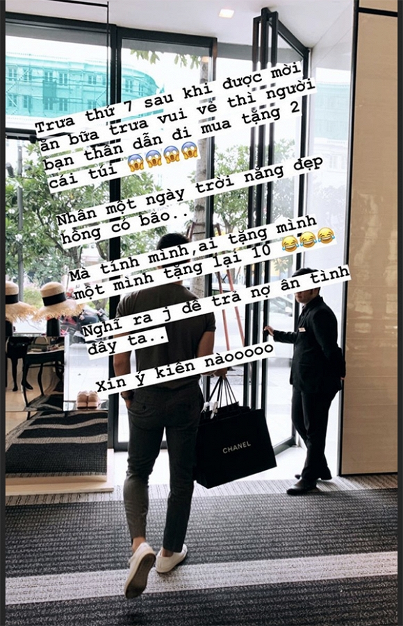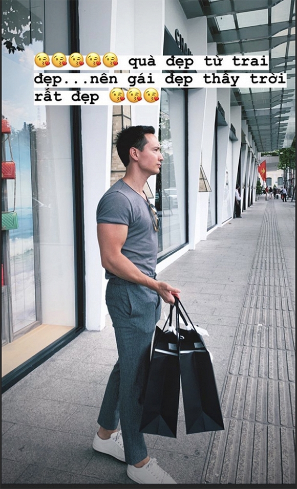 Tiếp đó, nữ ca sĩ lại khoe ảnh chính diện của anh cùng cách xưng hô siêu đáng yêu: "Quà đẹp từ trai đẹp nên gái đẹp thấy trời rất đẹp". Sau đó, Hà Hồ không ngại ngần khoe trạng thái vui vẻ của mình kèm chú thích: "Và đây là trạng thái chanh xả khi thấy túi quà không lí do".