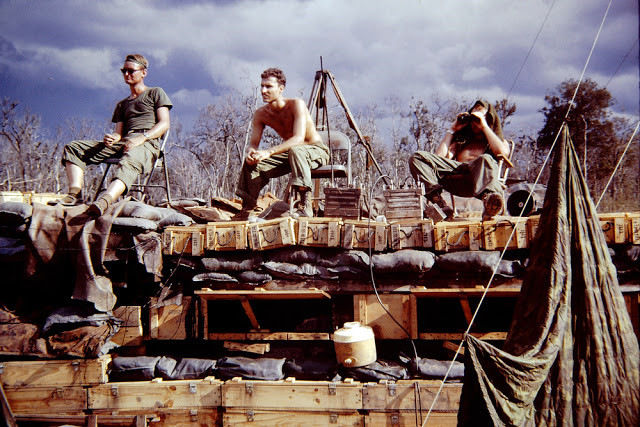 Ba lính Mỹ ngồi nghỉ trên boong-ke trong cuộc chiến tranh Việt Nam. Một người quan sát khu vực xung quanh bằng ống nhòm. Ảnh: The Vietnam Slide Project.