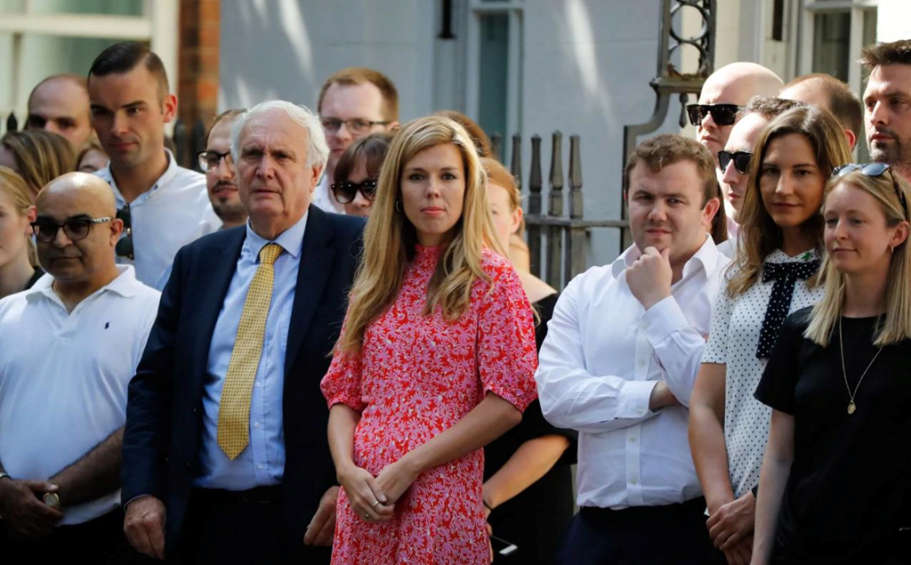 Cô Carrie Symonds (váy đỏ), bạn gái 31 tuổi của tân thủ tướng, cựu giám đốc truyền thông của đảng Bảo thủ, đã không đi bộ qua ngưỡng cửa phố Downing với ông Johnson sau khi Nữ hoàng Elizabeth chính thức bổ nhiệm ông làm thủ tướng. Thay vào đó, cô đứng cùng nhóm các trợ lý và những người ủng hộ để chào đón ông phía bên ngoài.