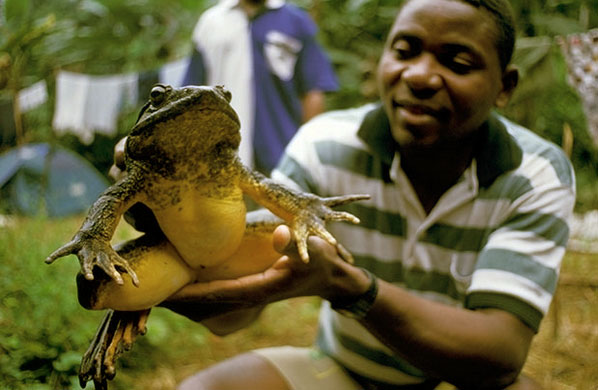 Ếch Goliath, loài ếch lớn nhất thế giới, có thể dài hơn 0,3m và nặng gần 3 kg khi trưởng thành