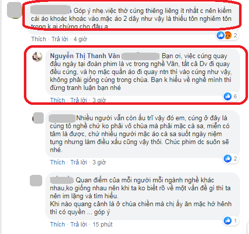 Trước nhận xét này, Phi Thanh Vân đáp trả với lời lẽ lịch thiệp khiến antifan câm nín: "Bạn ơi, việc cúng quay đầu ngày tại đoàn phim là việc trong nghề Vân. Tất cả diễn viên đi quay đều cúng, và họ mặc quần áo đi quay như thế nào thì vào cúng như vậy, không phải giống cúng trong chùa. Bạn không hiểu về nghề mình thì đừng tranh luận bạn nhé".