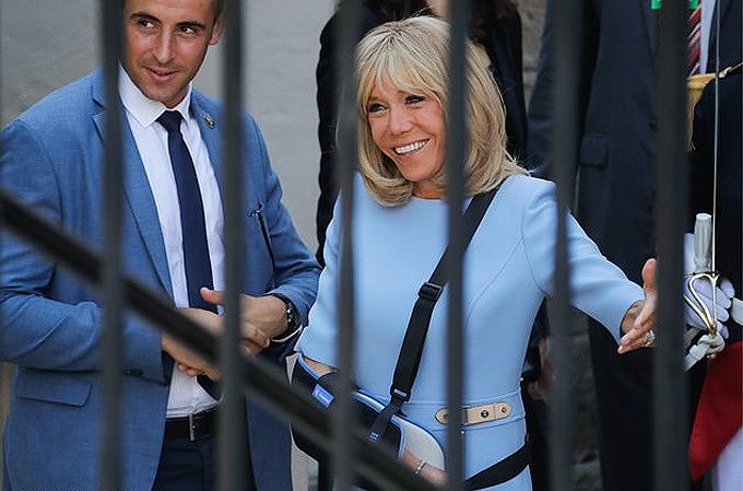 Xuất hiện bên chồng, bà Brigitte mặc một chiếc váy màu xanh nước biển, khoe vóc dáng cân đối ởtuổi gần 70. Trông tinh thần của bà rất tốt, dù đang đeo đai đỡ tay ở bên phải. Gương mặt của đệ nhất phu nhân Pháp được nhận xét trông căng sáng và trẻ trung hơn.