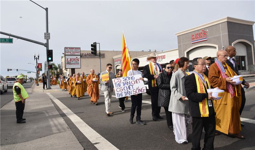 Hàng trăm tăng ni và Phật tử hệ thống chùa Tầm Nguyên, Bắc California, kết hợp cùng Phật tử từ khắp các tiểu bang Hoa Kỳ và tại Little Saigon, xuống đường biểu tình tuần hành chống Cộng Sản Việt Nam và chống Việt gian tại Little Saigon, thành phố Westminster.