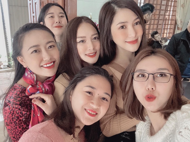 Trong ảnh, nữ ca sĩ diện áo len dài tay, khoét cổ sâu kết hợp cùng chân váy đen. Cô để tóc buông xõa tự nhiên, trang điểm đậm, rạng rỡ đứng cạnh những người bạn thân ở quê.