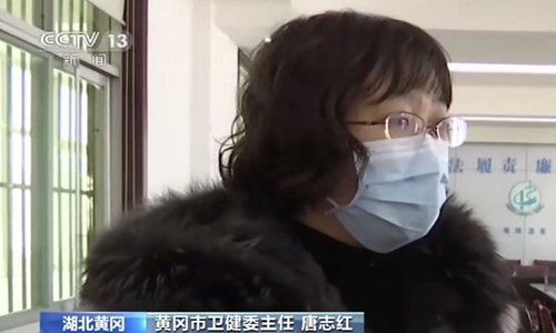 Bà Tang Zhihong, trưởng phòng y tế thành phố Hoàng Cương, tỉnh Hồ Bắc, trở lời trên truyền hình Trung Quốc. Ảnh: Global Times.