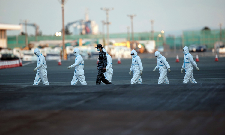 Giới chức Nhật Bản mặc đồ bảo hộ tới du thuyền Diamond Princess ở cảng Yokohama hôm qua. Ảnh: AP.