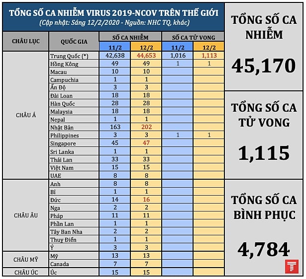 Cập nhật diễn biến dịch viêm phổi Vũ Hán (sáng 12/2). Cho đến 9 giờ sáng nay UB Y tế Nhà nước Trung Quốc cho biểt số ca nhiễm bệnh tăng lên 44.653 ca; số ca tử vong tăng thêm 97 ca, lên 1.113 người.