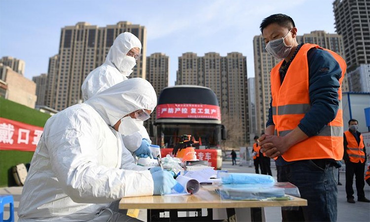 Công nhân đăng kư trước khi vào làm việc tại một công trường ở thành phố Lan Châu, tỉnh Cam Túc, Trung Quốc ngày 3/3. Ảnh: Xinhua.