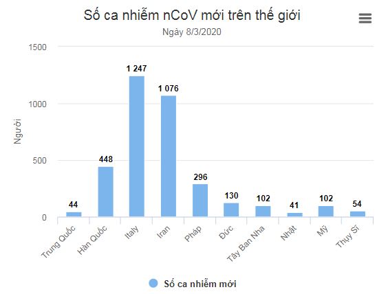 Số ca nhiễm tại Italy và Iran tăng nhanh trong nhiều ngày. Italy ghi nhận thêm 1.247 trường hợp dương tính nCoV, nâng tổng số người nhiễm tại nước này lên 5.883, trong khi số người nhiễm tại Iran là 5.823 người, tăng 1.076 trường hợp.